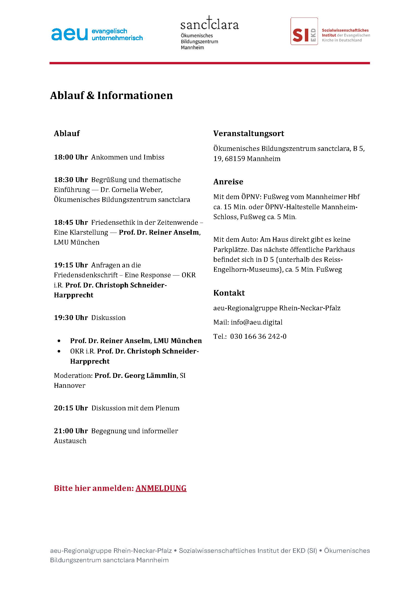 Diese Kontroverse bildet den Anlass für eine Diskussion mit dem federführenden Autor der Friedensdenkschrift, Prof. Dr. Reiner Anselm von der LMU München, und dem Mitinitiator der Initiativen „Sicherheit neu denken“ und „Kirche des gerechten Friedens werden“ der Evangelischen Landeskirche in Baden OKR i.R. Prof. Dr. Christoph Schneider-Harpprecht.